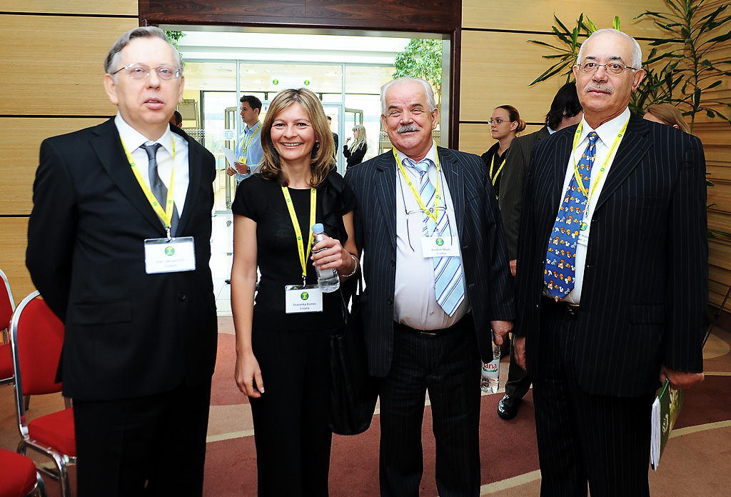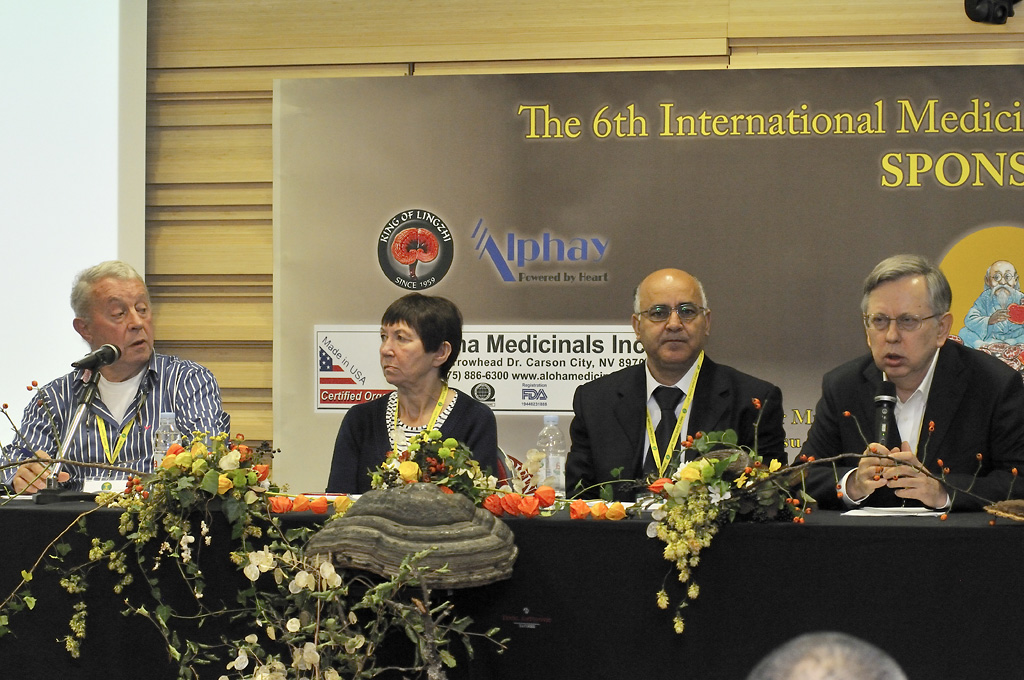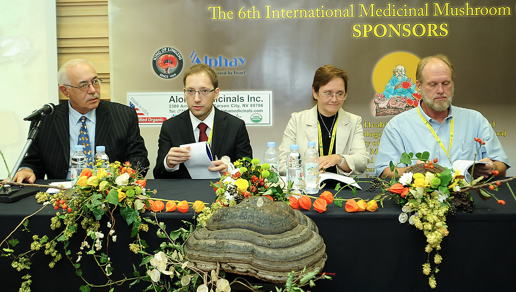 Moderator i tri uvodničara panel diskusije “Ljekovite gljive i rak”: moderator prof. L. van Griensven (Nizozemska), prof. U. Lindequist (Njemačka), dr. J. Mahajna (Izrael) i dr. I. Jakopović.