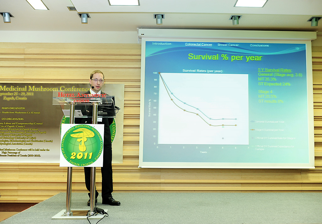 Neven Jakopović prikazao je impresivne rezultate znanstvene studije 5-godišnjeg preživljavanja pacijenata s uznapredovalim i metastatskim rakom debelog crijeva i rakom dojke. Pacijenti koji su koristili velike doze ekstrakata ljekovitih gljiva kompanije Dr Myko San – Zdravlje iz gljiva živjeli su mnogo dulje, i s boljom kvalitetom života.