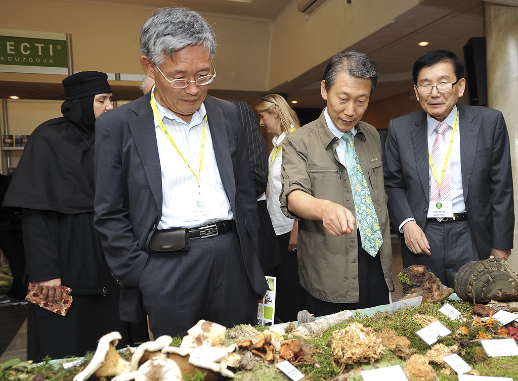 Znanstvenici iz Koreje razgledavaju izložene gljive: Jong Soo Lee i Tae Soo Lee.